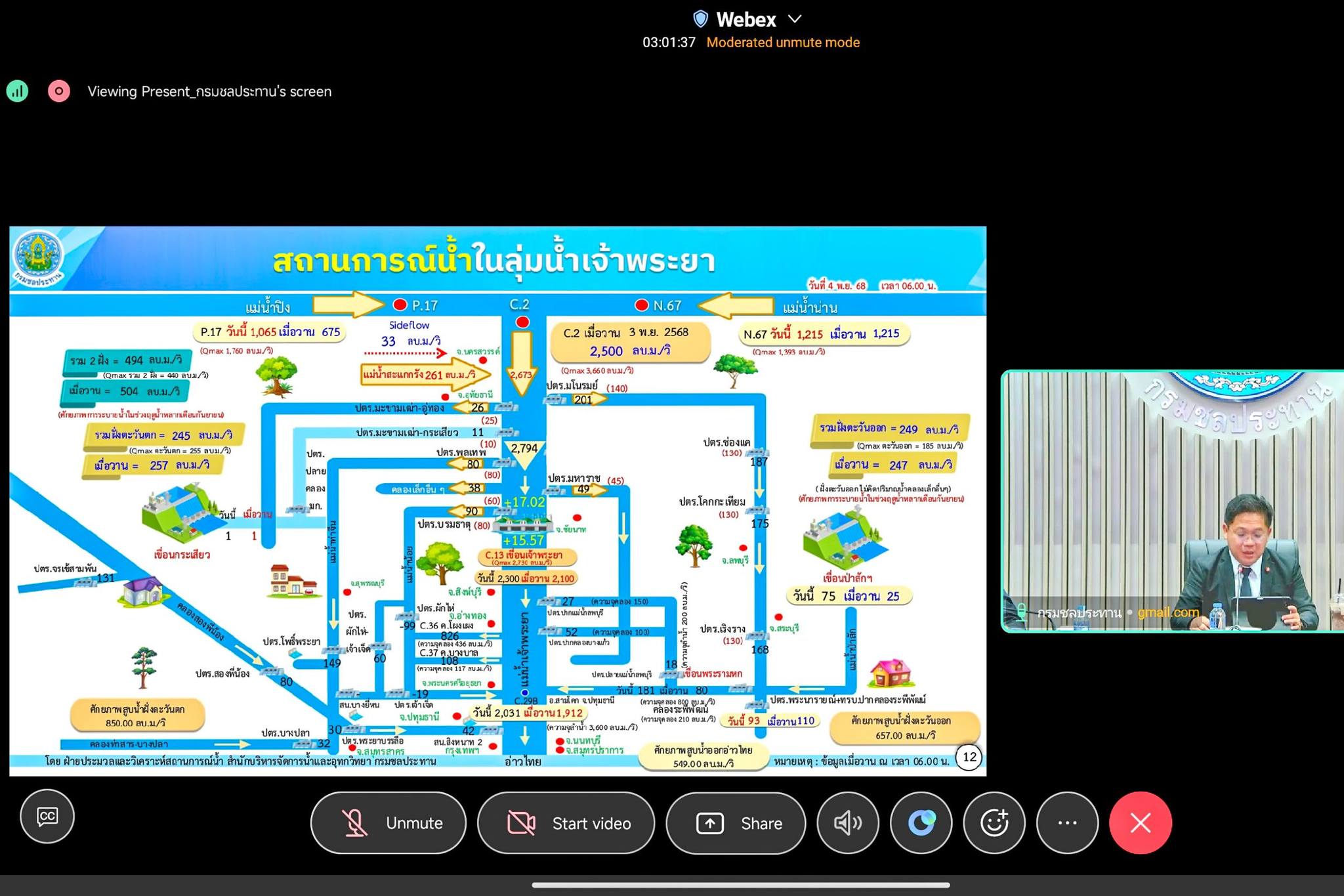 วันนี้ (4 พฤศจิกายน 2568) เวลา 14.00 น. ณ ห้องประชุมศูนย์ปฏิบัติการน้ำอัจฉริยะ สำนักงานชลประทานที่ 15 นายสุรพงศ์ เจริญการยนต์ ผู้อำนวยการสำนักงานชลประทานที่ 15 มอบหมายให้ นายณัฐพงศ์ เกิดด้วยทอง หัวหน้าฝ่ายประมวลวิเคราะห์สถานการณ์น้ำ ส่วนบริหารจัดการน้ำและบำรุงรักษา เข้าร่วมประชุมติดตามสภาพอากาศและสถานการณ์น้ำ โดยมี นายภราดร ปริศนานันทกุล รัฐมนตรีประจำสำนักนายกรัฐมนตรี เป็นประธานการประชุม ผ่านระบบ Video Conference จากห้องประชุม 302 ทำเนียบรัฐบาล